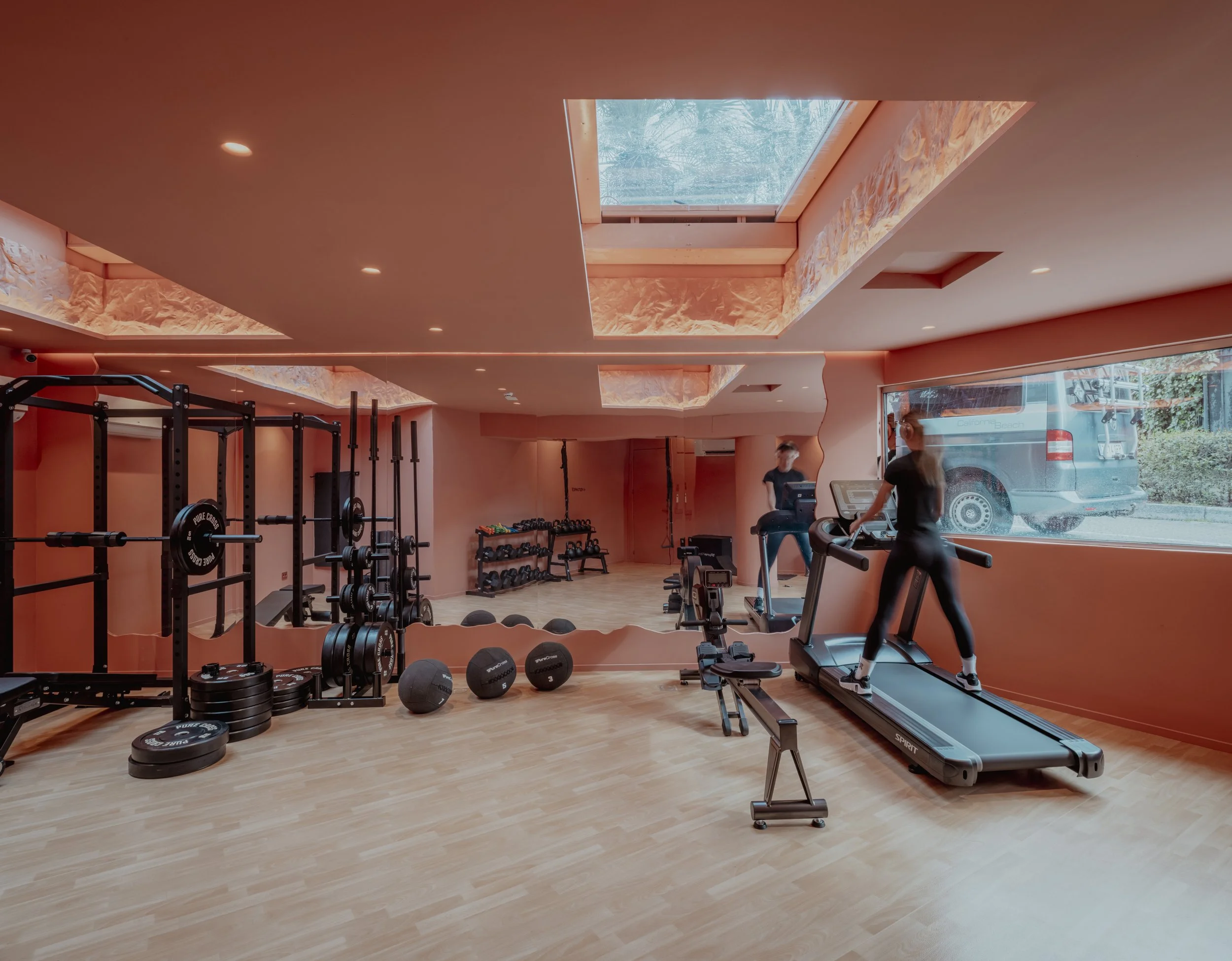 Indoor gym with pink walls, wood floors, and a large window. Features weightlifting equipment, a treadmill with a woman running, and two women working out.