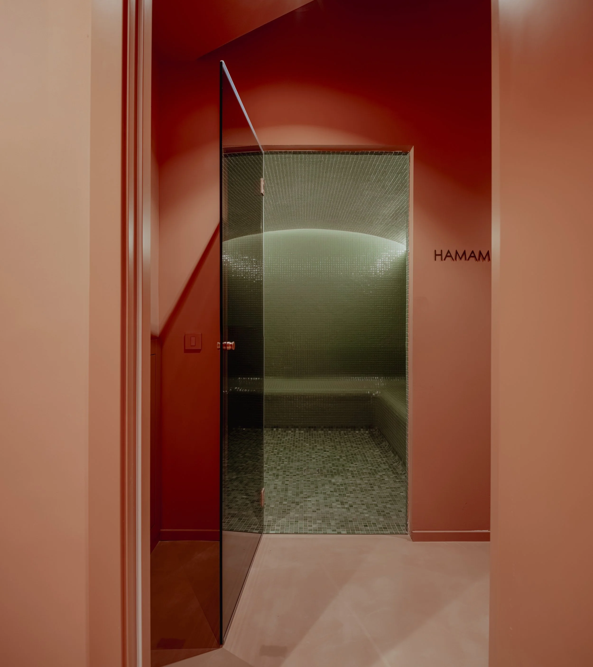 A doorway leading into a sauna with a glass door. The sauna has green mosaic tiles and a bench. The walls and ceiling are painted in a reddish color. The word 'HAMAM' is written on the wall to the right of the doorway.