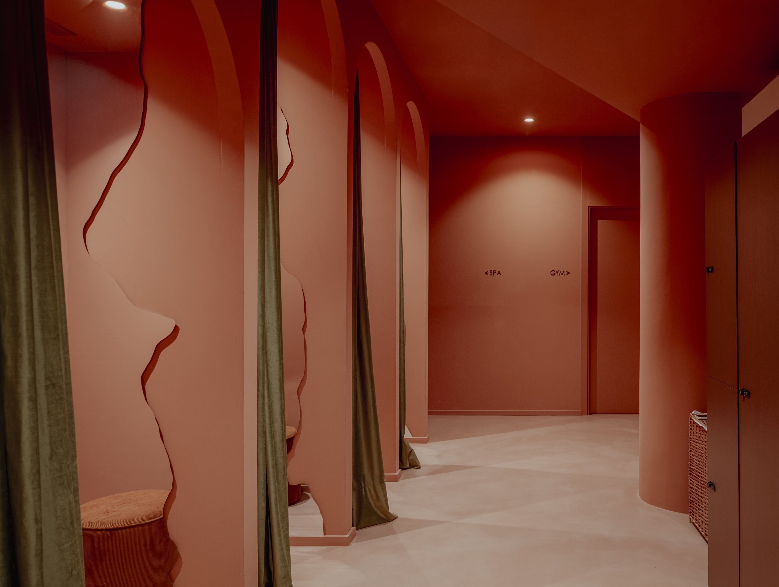 A peach-colored interior space with curvy design elements, several fitting rooms with green curtains, and a sign on the wall indicating directions to a spa and gym.