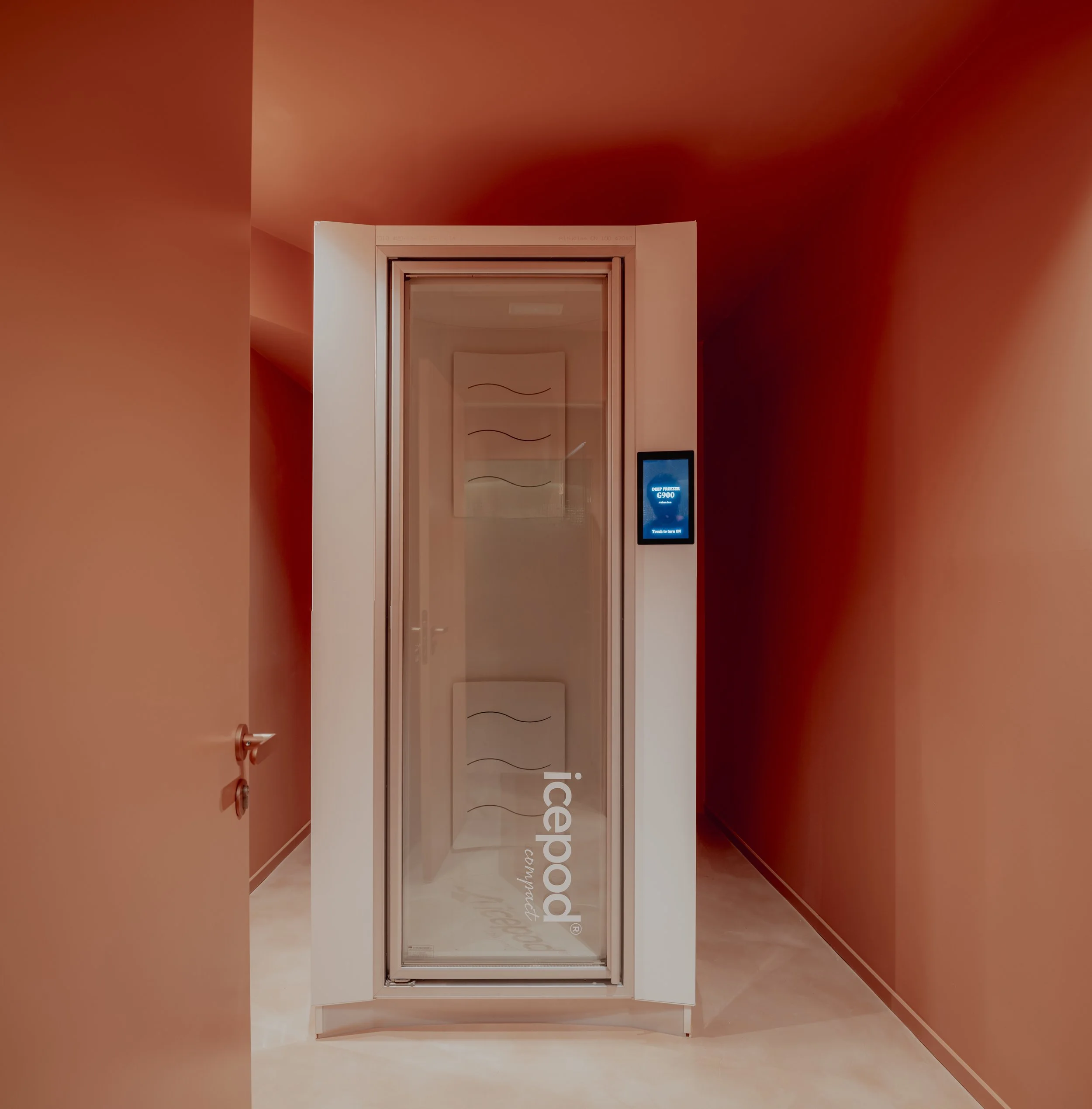 A modern ice pod cryotherapy chamber with a digital control panel, situated in a room with peach-colored walls.